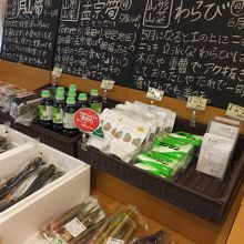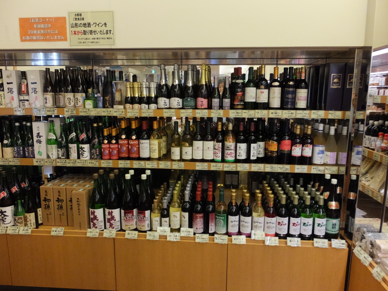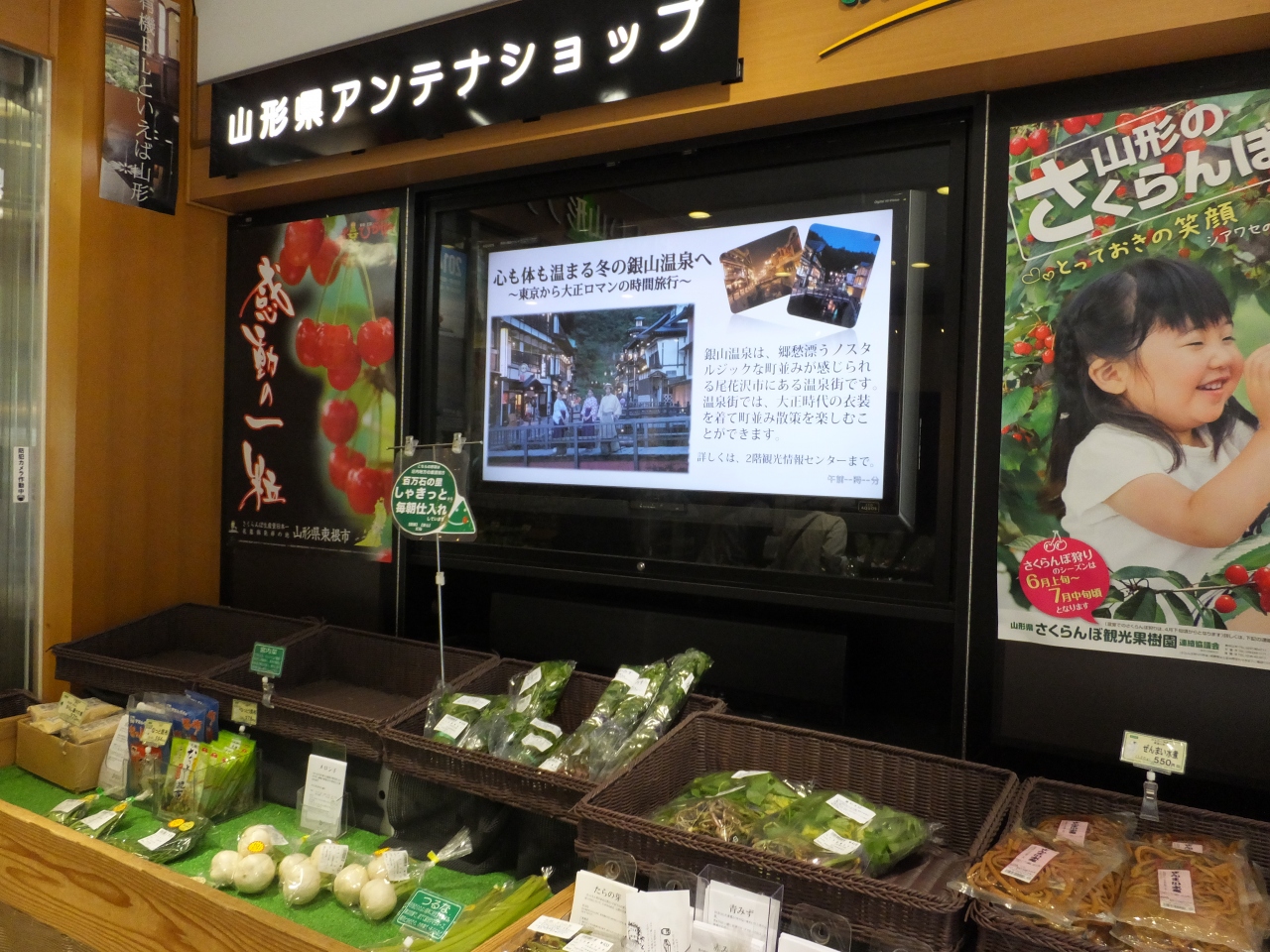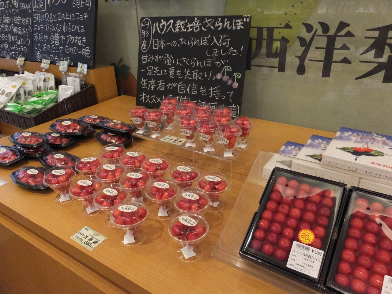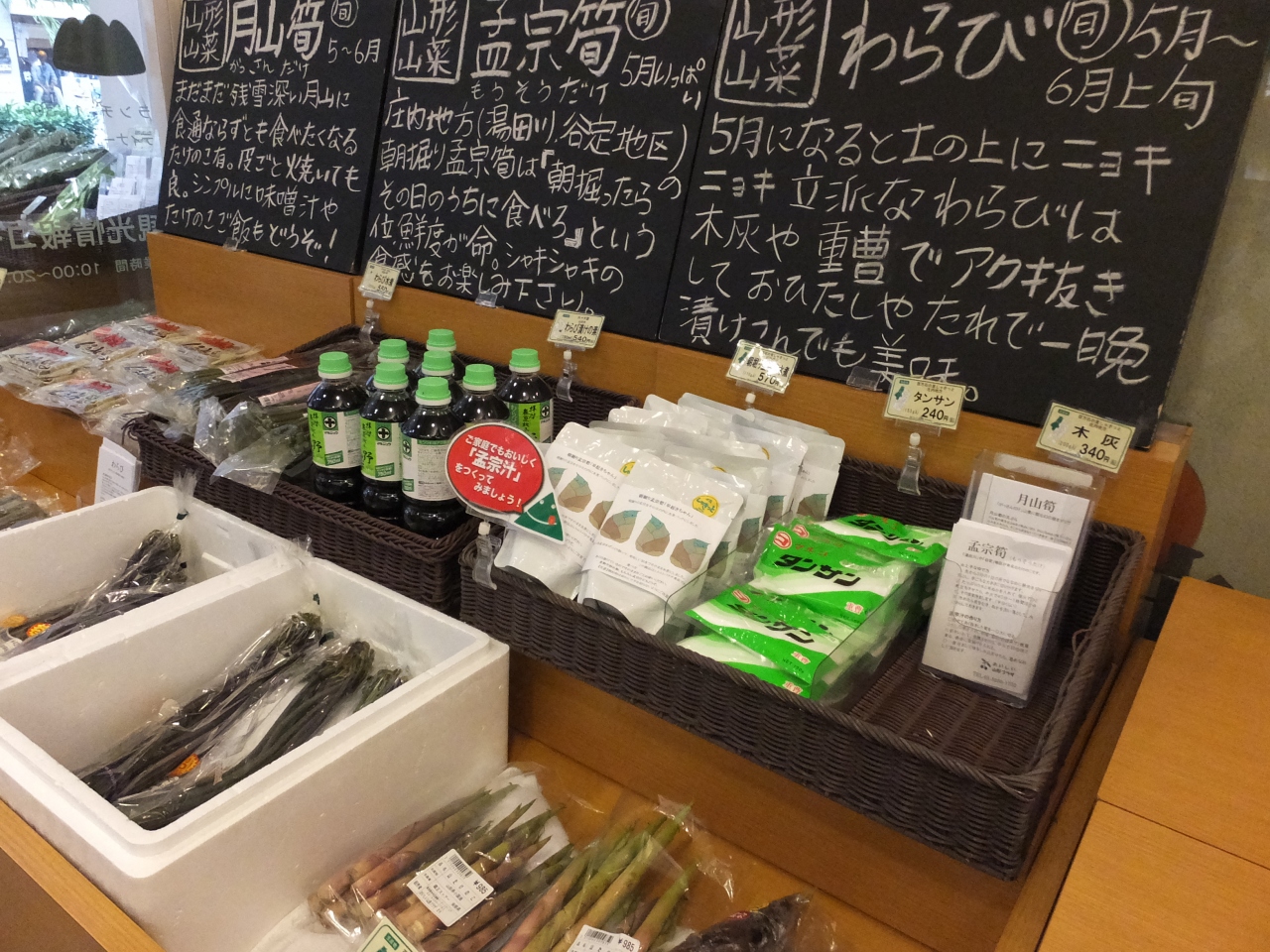 店の入口には「タラの芽」「行者にんにく」などちょっとなじみのある野菜から、「しどけ」「あいこ」「うるい」「こごみ」など聞いたことのないような野菜まで山形産のいろいろな野菜が並べられています。それぞれに調理法を書いたレシピも添えられているのでありがたいです。店内にはさくらんぼから地酒まで、たくさんの山形の名産品が並んでいます。