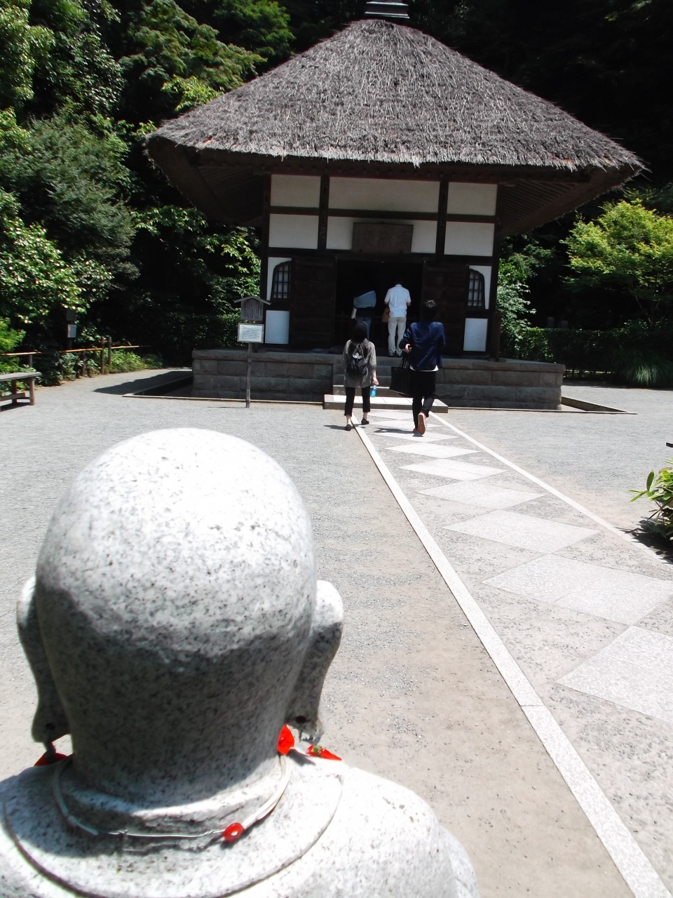 明月院本堂を左方向に進むと穏やかなお地蔵石坐像が、お花が供えられています。「花想い地蔵」さんです。目の前は明るい空地、その奥に宗猷堂の扁額のある堂があります。これが開山堂です。開山の密室守厳禅師に一礼合掌。