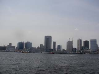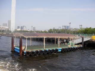 東京みなと祭の会場から、晴海埠頭公園抜けて無料の海上シャトルバスで日の出桟橋に向かいます。発車時刻の10分前に行ってみると行列が出来ていて、列が進むと桟橋の入口で人数を数えていて、平らな船は1階と2階の船室があり定員300人とのことで全員乗れました。