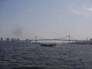 後部に階段があり、2階の屋根の後ろのデッキに乗ると眺めがよく、定刻に出発すると日の出桟橋は直線距離では近く、レインボーブリッジを見ながら5分ほどで到着しました。