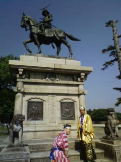 立派な石垣に沿って登っていくと、まず目に入るのが、伊達正宗の騎馬姿。