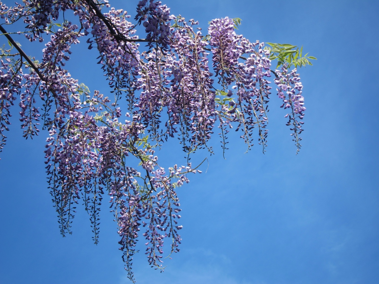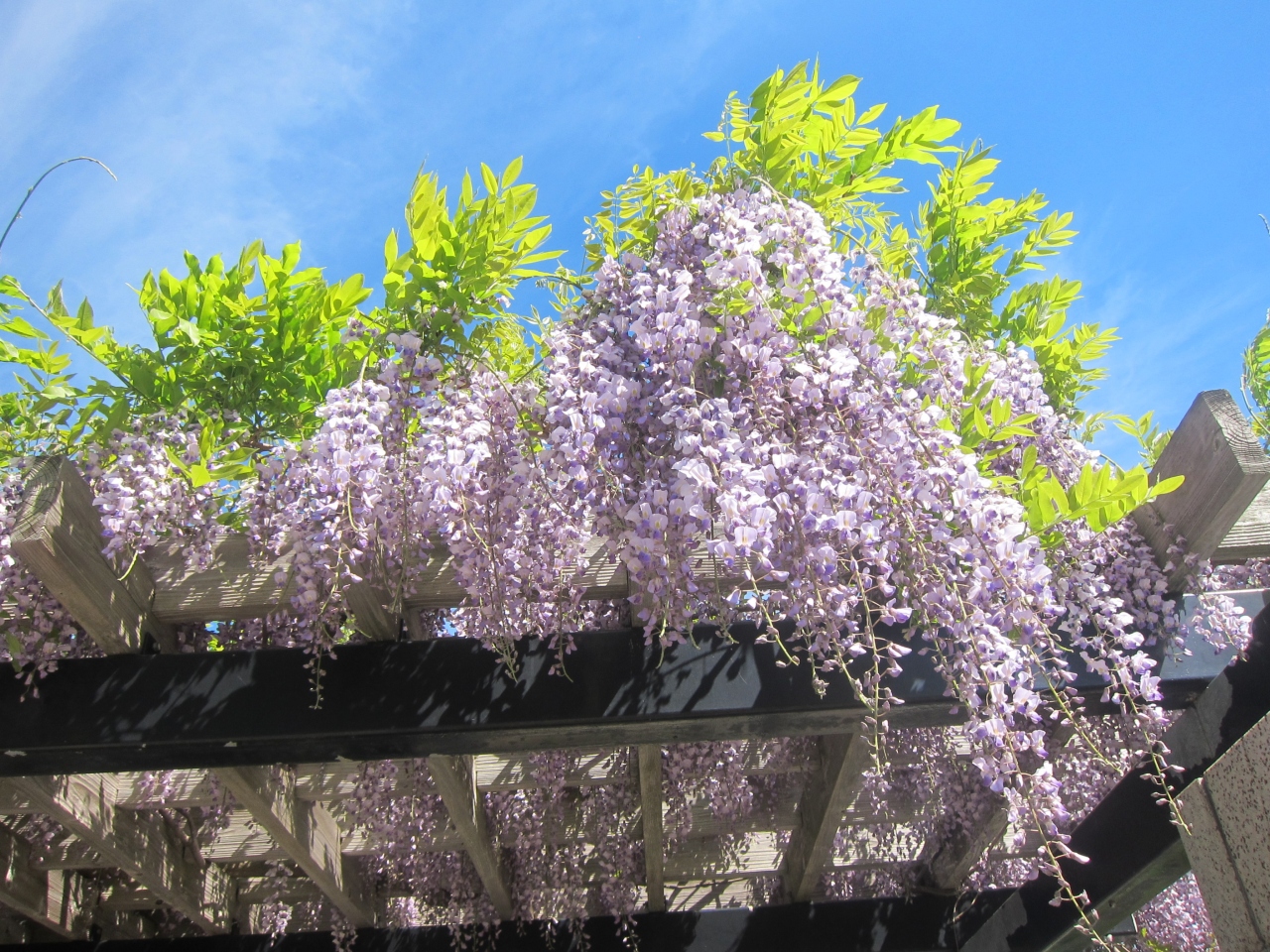 毎年、5月末~6月初旬にかけて、藤の花が咲き乱れます。2014年は6月1日の時点でかなり咲いていました。花の房の先の方はつぼみで、付け根の方もまだ、散ってはおらず、きれいに花を観賞できました。