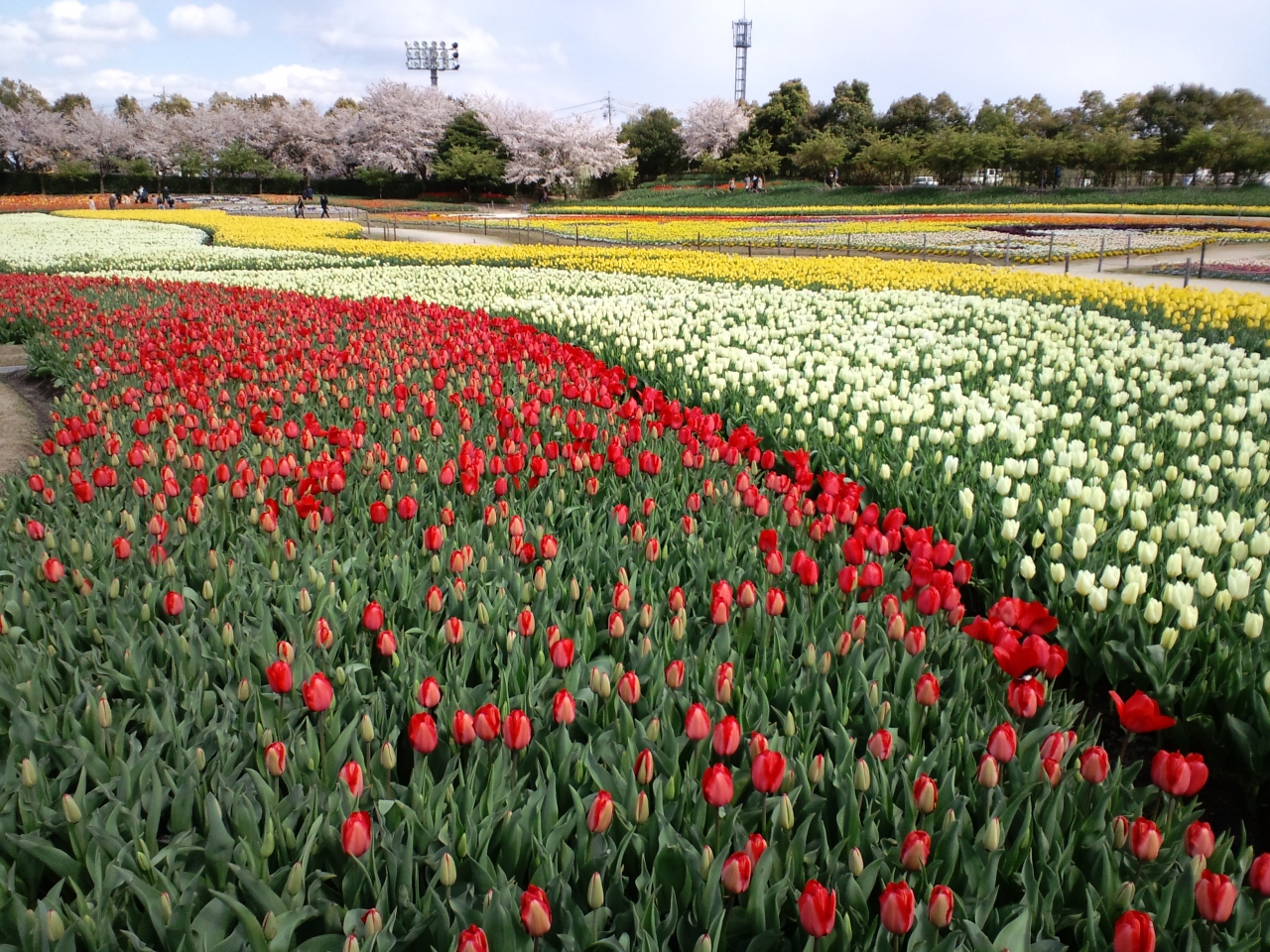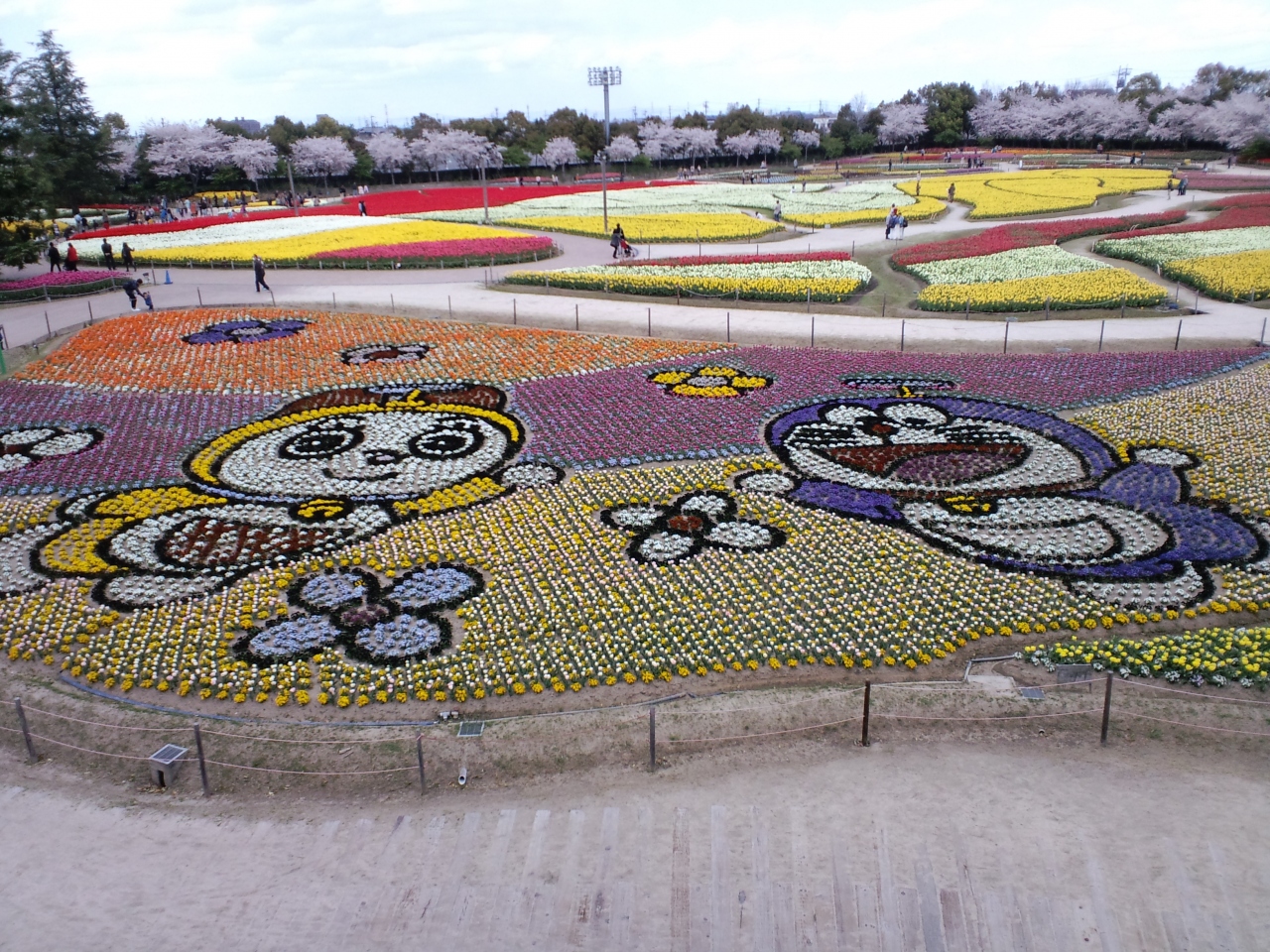 色々なカラーのチューリップが広い敷地内に沢山咲いていて、とても綺麗でした。ちょうど桜も咲いている時期だったので、両方楽しめて良かったです。花でドラえもんの絵が描かれていて、展望台の上から綺麗に見えました。