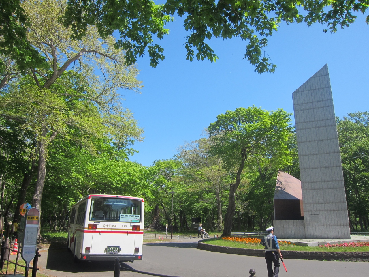 JR千歳駅の西方1kmほどのところにあり、公園の横には千歳川が流れています。公園は丘陵地の始まりで、ここから西の方には支笏湖や樽前に続く丘陵と森が広がっています。公園にある千歳神社の横の坂の上には“ろうさん”として、碑が建っています。”ろうさん“はアイヌ語で、ここより川や海、ここより開けていく処、といった意味があるそうです。