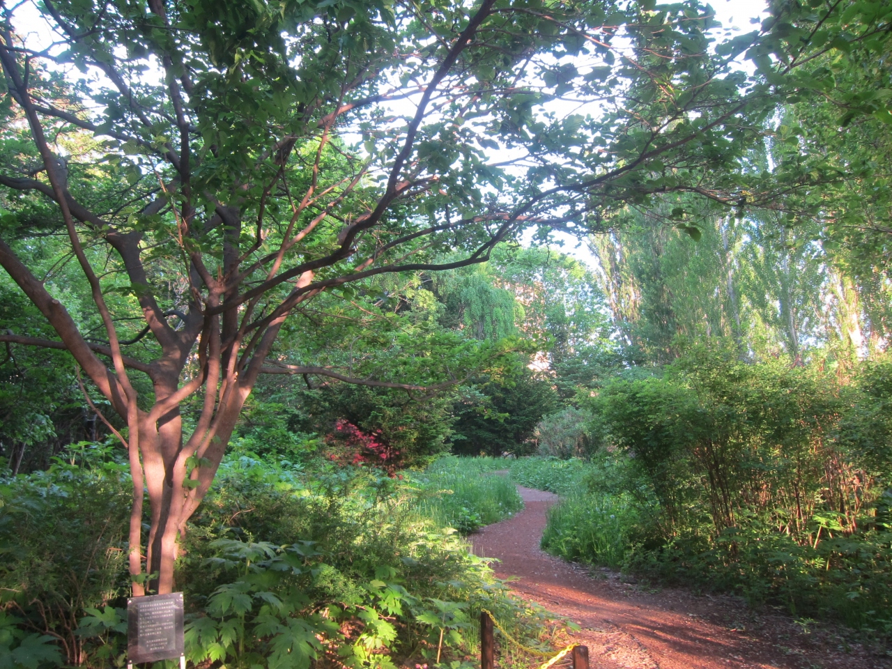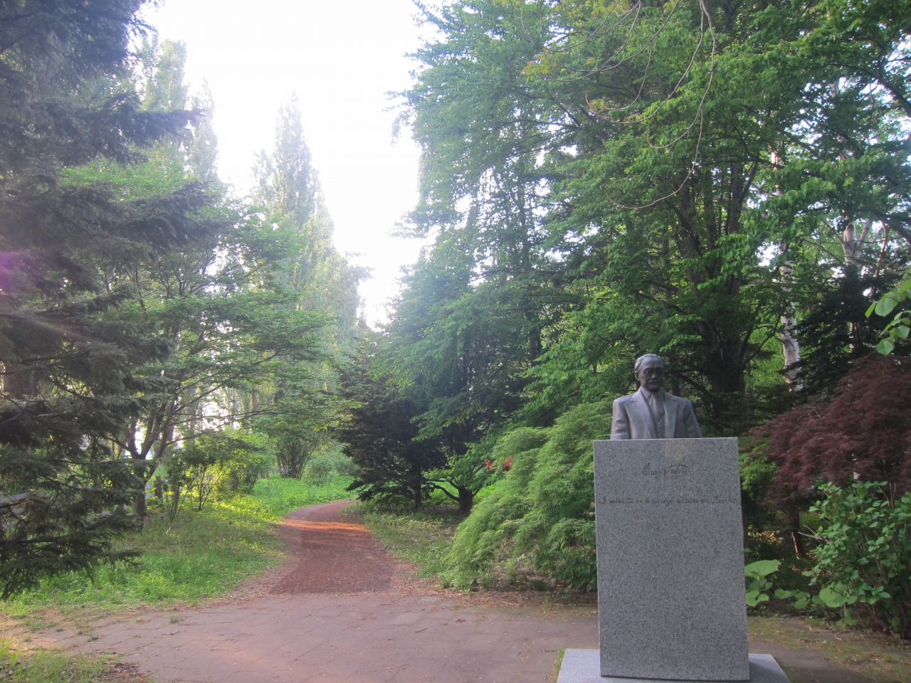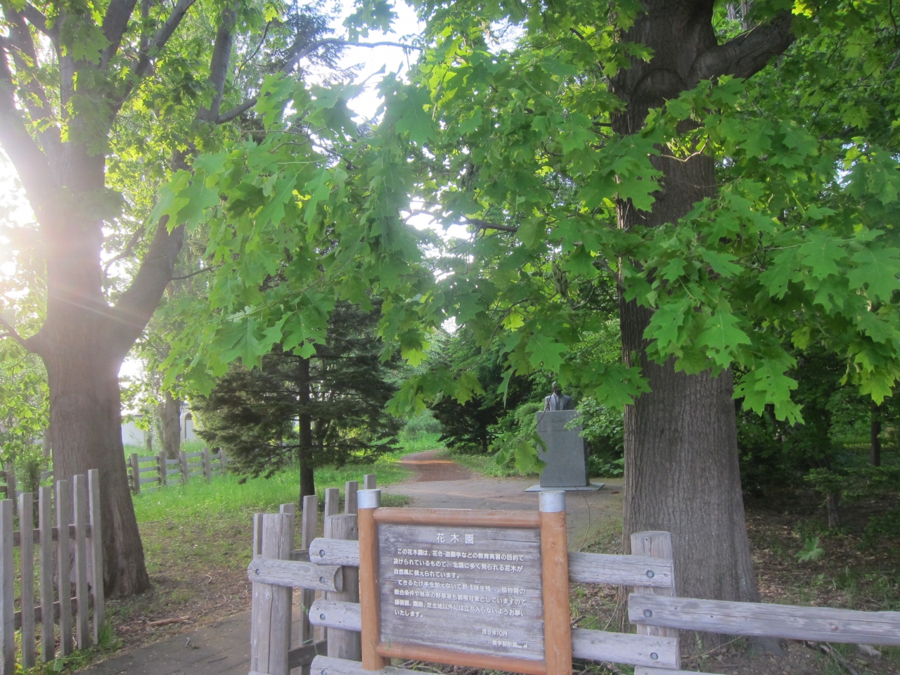 北海道大学構内のポプラ並木の隣にあります。大学の花木園といっても、薬用植物を研究しているような実験施設ではなく、新渡戸稲造の胸像のある庭園スペースです。庭園木の植わった緑多いスペースですが、庭園といえるほど、木が剪定されて整備されている感じはありませんでした。隣のポプラ並木と合わせて鑑賞するとよいと思います。