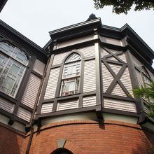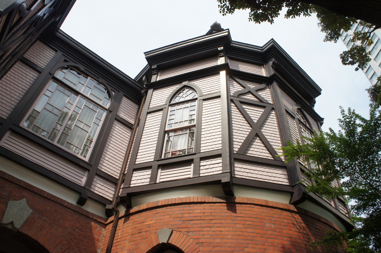 建物は、明治23年に完成。アメリカ人宣教師H.M.ランディス教授の設計で、当時アメリカで流行したネオゴチック様式の総赤煉瓦に、フランス瓦葺の2階建て。