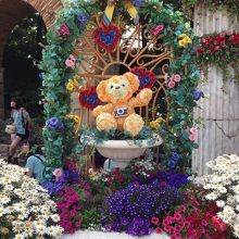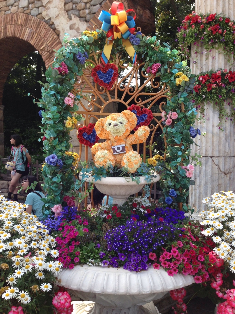 お花やきれいにデコレーションされたイースターエッグで彩られたオブジェがパーク内にたくさん飾られていてワクワクしました。。ミニーが小さなお花で作ったというダッフィーやシェリーメイの前には写真を撮る人の行列が出来ていました。