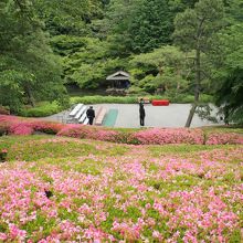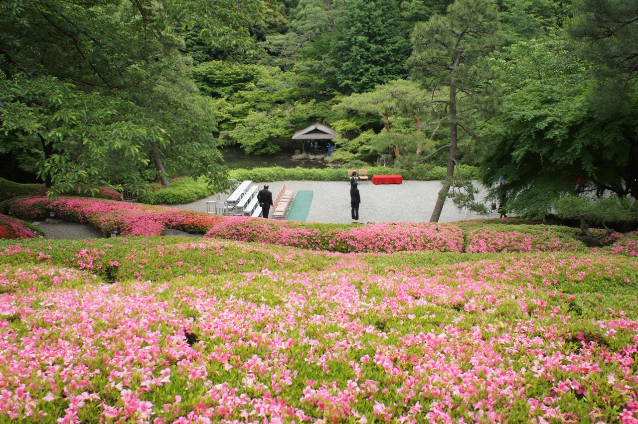 八芳園は、1万2千坪の敷地。広い庭園のある結婚式場です。江戸時代には一部が大久保彦左衛門の屋敷だったり、薩摩藩の所有になったりしたこともあるよう。この日は、専用の木戸から入って庭園だけを見学させてもらいましたが、つつじの刈込の上から、大きな池を見下ろすロケーション。結婚式の記念写真を撮る人たちの様子も見えました。