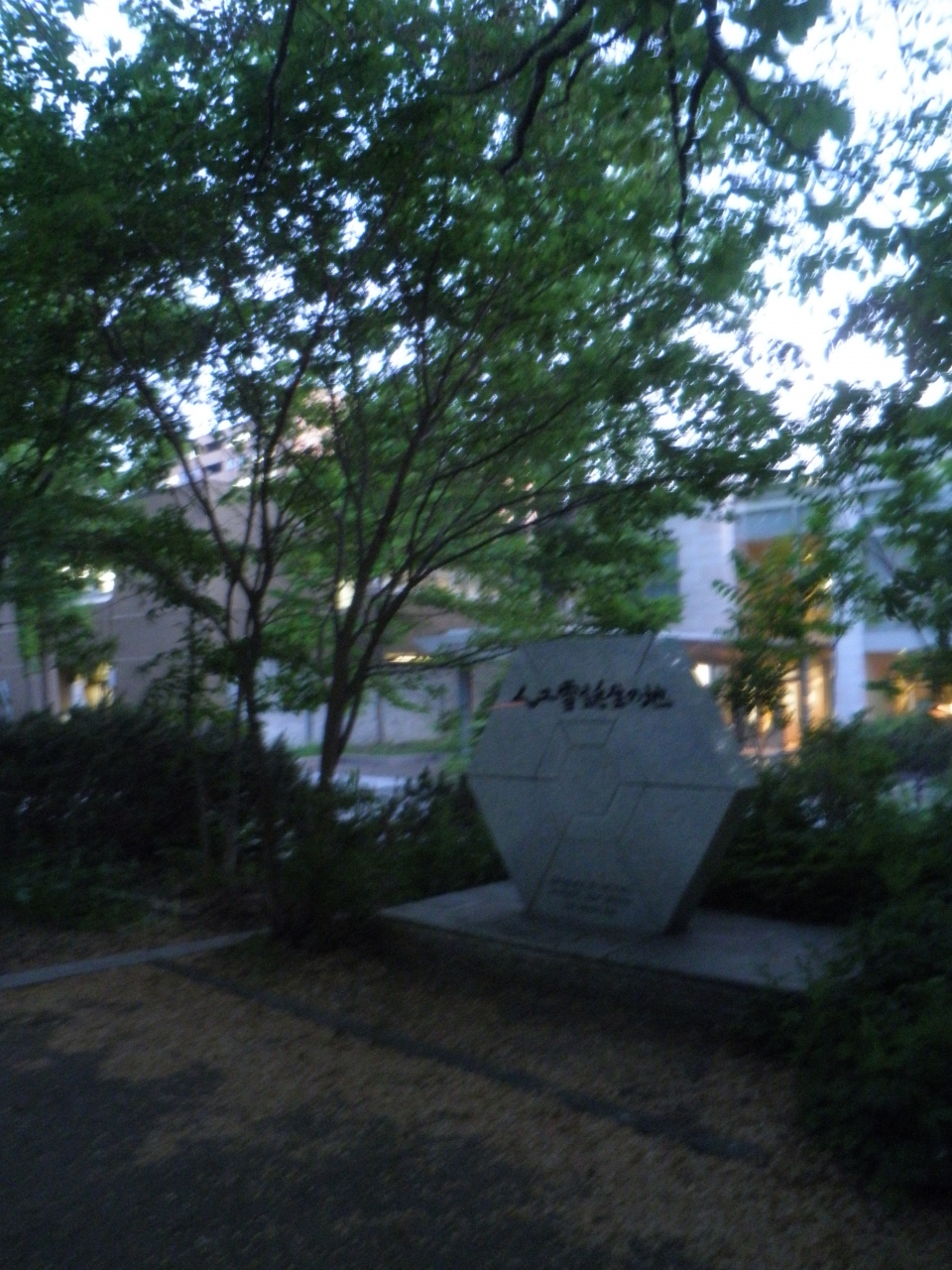 6月の札幌は例年は涼しいさわやかな気候なのですが、今年は30度を超える日が続いています。 それでも、夕方になると暑さがやわらぎ散策するのにいい感じです。 北海道大学のキャンパスを散策していると、クラブ活動で構内を走ったり、なにかの練習をする若者たちの姿を見かけます。 とくに学園祭の準備で賑わっていて、その片隅に人工雪誕生の地碑はたっています。 近くには大野池もあって涼しげでした。