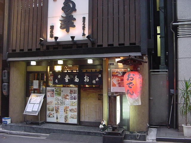 JR東京駅の八重洲口から日本橋にかけて、人通りの多い一角にあるおでんとお酒のお店。老舗の雰囲気もいいので、軽くビールとおでんでも立ち寄ってみたくなる店です。店構えも大きくて、でっかい赤い提灯が出迎えてくれるので迷いません。