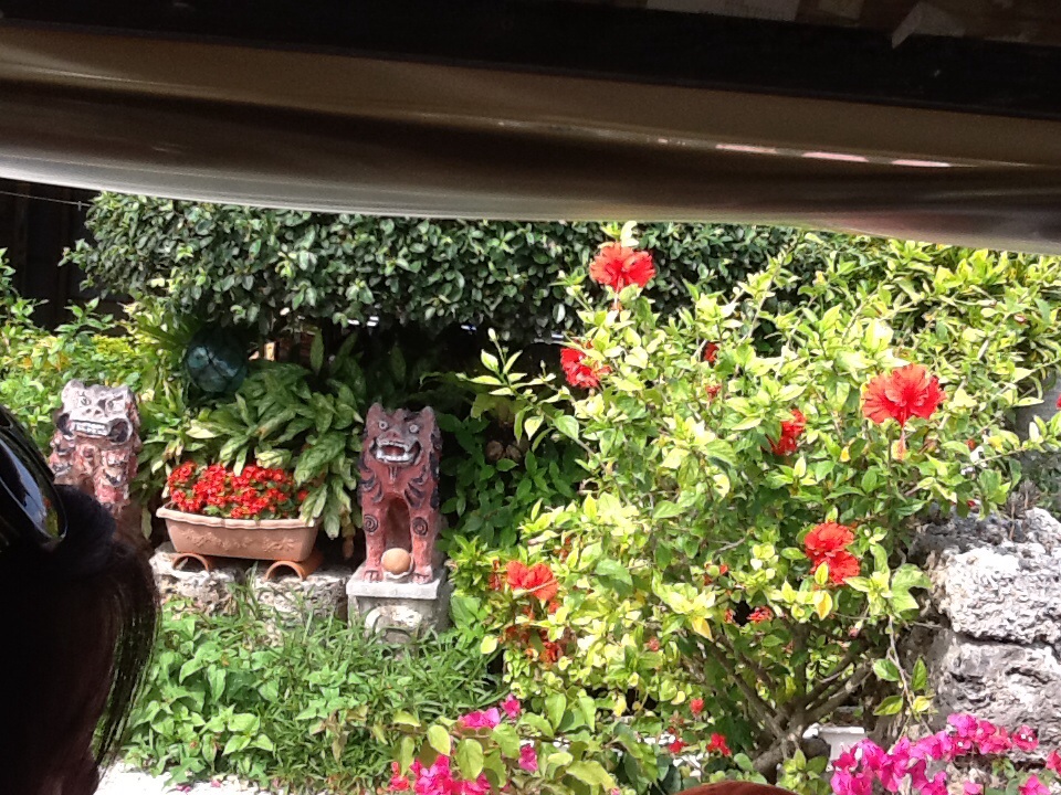 何処の家も綺麗なハイビスカス、ブーゲンビリアの花が咲いていて、道も綺麗に掃除され白い砂浜の様な道でした。時間が止まってるかの様なのんびりした気持ちになり、おじ~が三味線で沖縄民謡を歌ってくれました。本当~に癒された~!