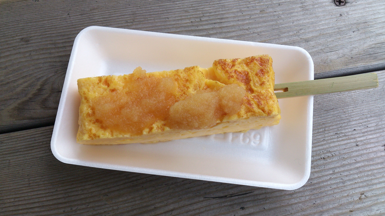 築地場外市場にある玉子焼き屋さん。場外に玉子焼き屋さんは何店舗かありますが、気軽に食べられるのでどこも人気です。食べ易く串が挿してある「串玉」が100円。甘さが甘め・控え目、更に大根おろしの有無が選べます。アツアツのふんわりした玉子焼きに大根おろしが良く合いました。