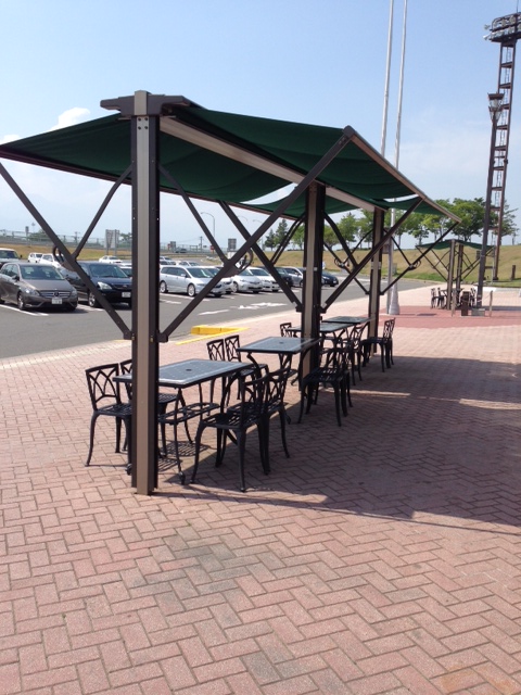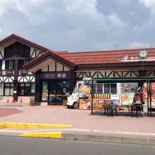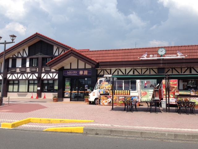 建物もお洒落なサービスエリアです。建屋の前には移動販売で良くつかわれる車でのフード販売があり、その前にはオープンテラス。