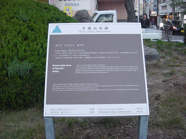 松山駅を下車して、すぐ左へ。高知などへ向かう高速バス乗り場の前に句碑があります。そこだけが緑に囲まれていてのんびりしています。写真を撮っている観光客もいました。松山市観光案内所がすぐ近くにあって、そこで情報を入手しました。