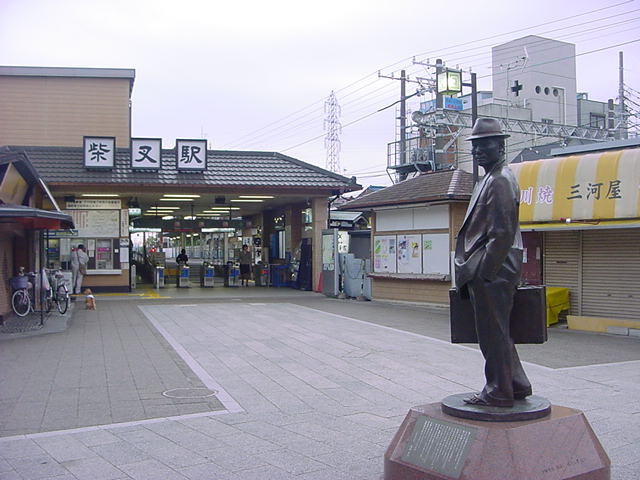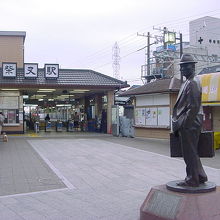 京成金町線の柴又駅を下車するとすぐ。駅前広場に立っている寅さん像があります。まさに柴又のシンボルと言える人だけに、みんなこの前で記念写真を撮っています。すでに駅前から下町情緒がたっぷりで、町歩きのスタートラインとしてにぎわっています。