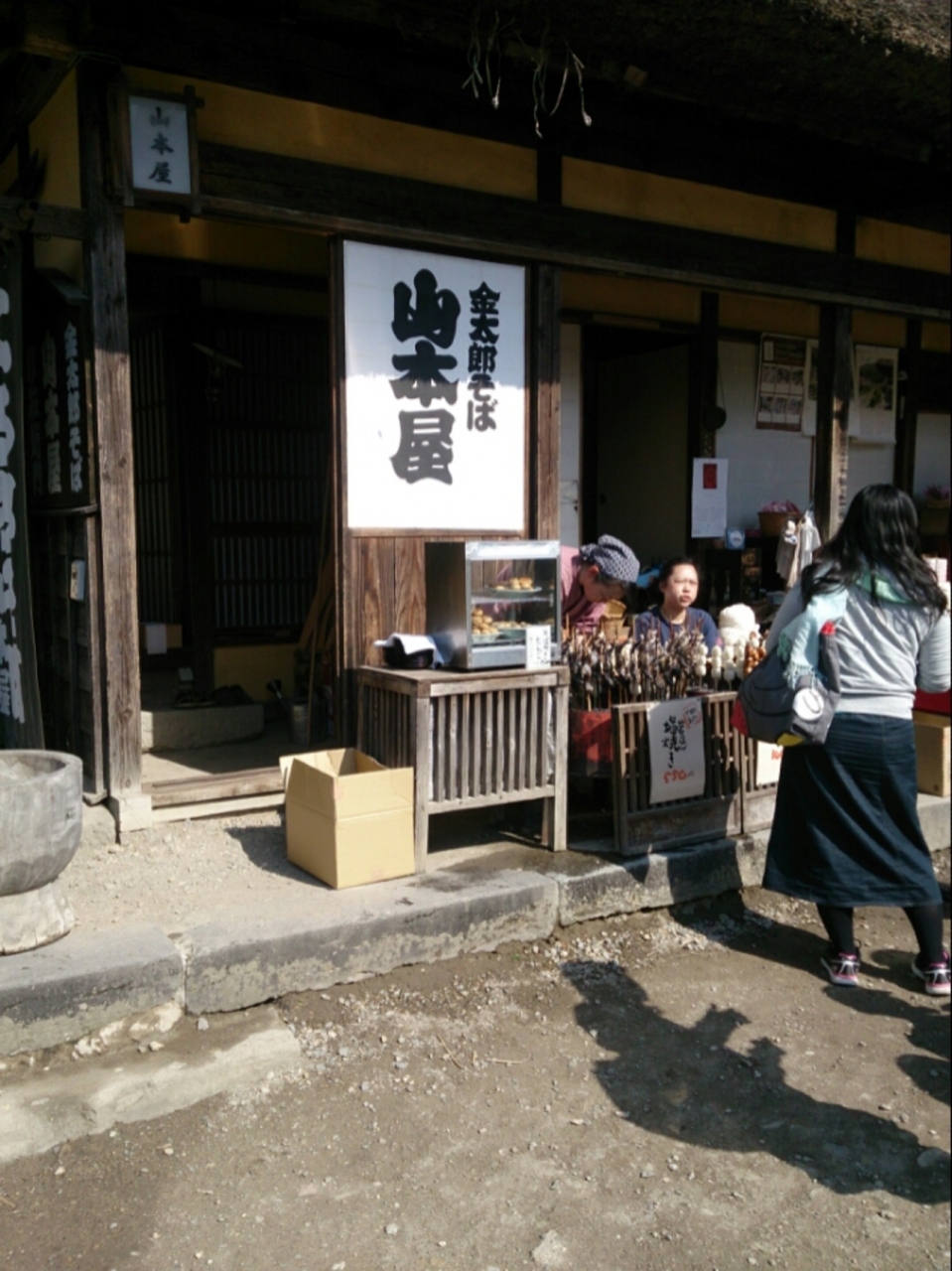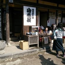 山本屋さんは金太郎食堂ともいいます。そばと味噌をメインにしたところですがねぎそばはありません。一番人気はくるみをつゆに入れて甘みと風味が引きだつ、くるみそばが人気です。そして店先のだんご焼き販売は街道一の人気で飛ぶように売れています。えごまのじゅうねん味噌がついただんごは絶品です!!