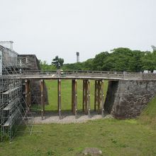 現在、本丸の発掘調査と併せて本丸一文字門の復元工事をしていました。