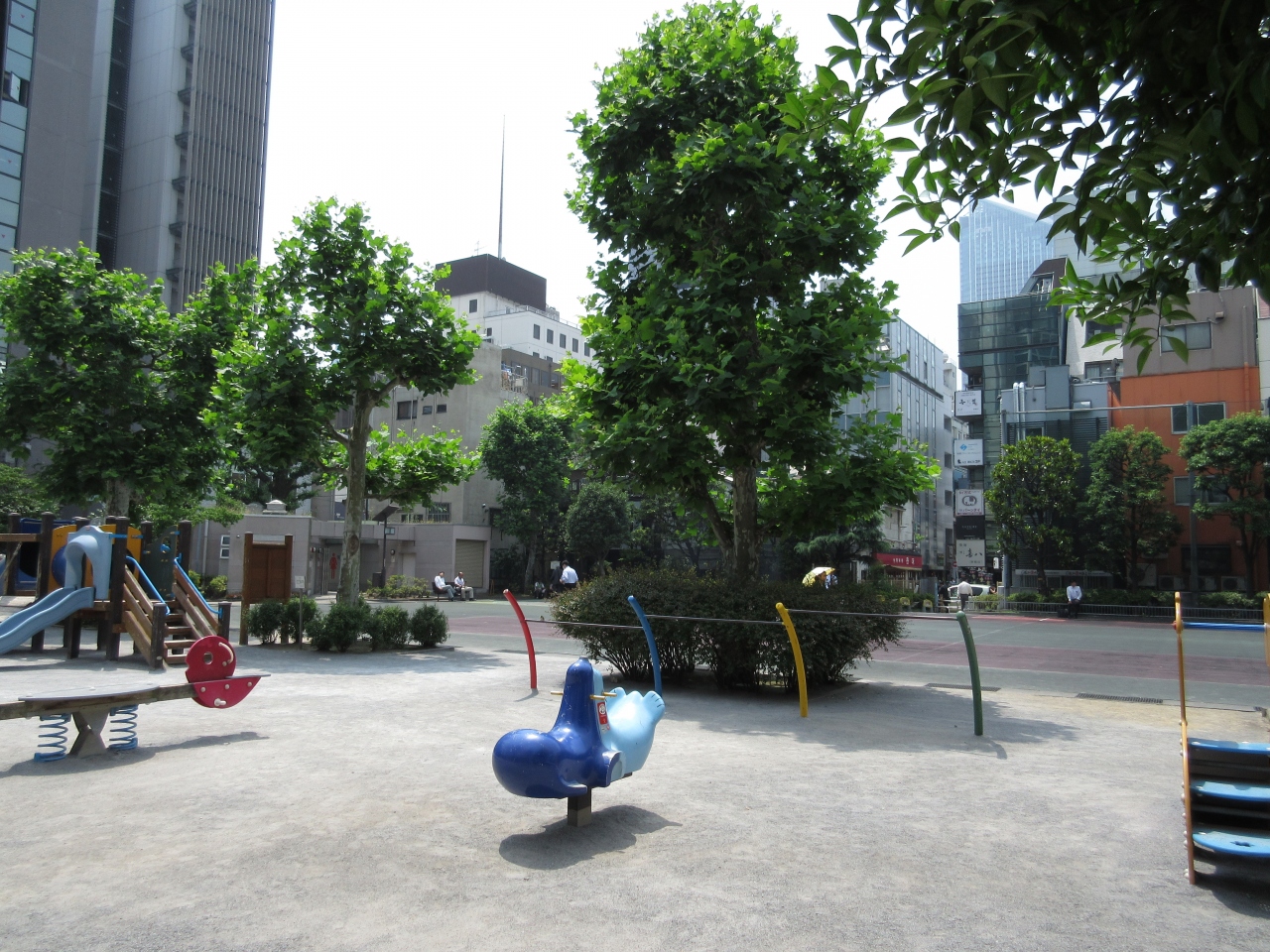 新橋駅烏森口の近くにある公園です。もとは港区立桜田小学校の校庭だったところです。遊具がそこかしこにあったり、運動場のトラックがそのままのかたちで残っています。古くからあった小学校とのことですが、今は生涯学習センターのようです