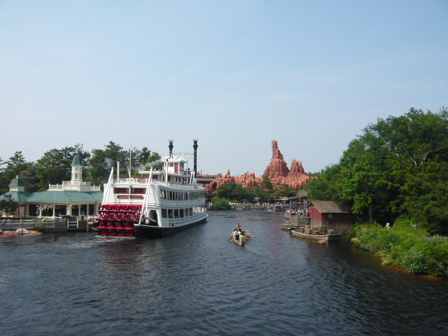 30分ほど並んで出発。座席は右側がおすすめ。混雑日でも一列にカップルのみかグループ4名まで座れますが最後の人数調整で相席になります。カヌー乗り場を過ぎてからマークトウェン号とビッグサンダーマウンテンが見えるあたりの景色がお気に入りです。