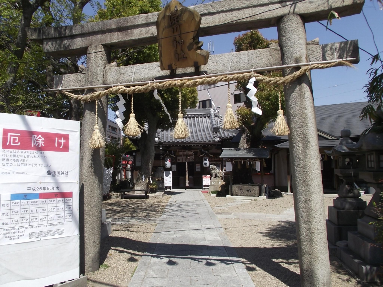 鳥居脇に厄除けの大きな看板がある淀川神社だった。