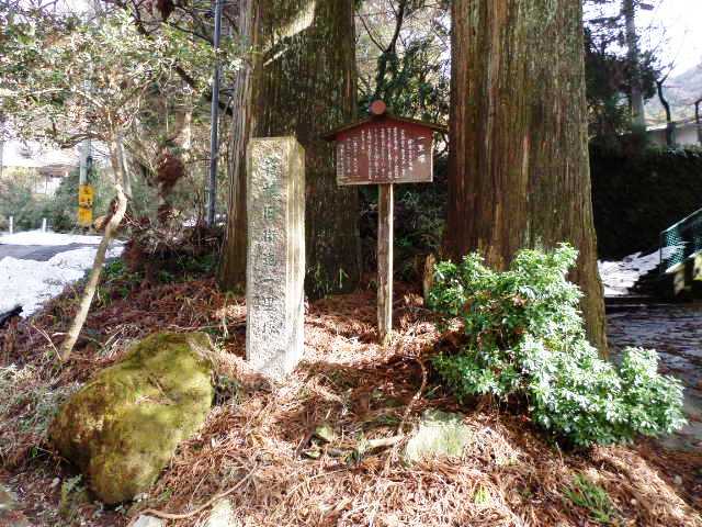 箱根一里塚は江戸時代旅人の目印として徳川幕府が作った日本橋から数えて23里目にある塚で箱根町の中では湯本茶屋、畑宿、箱根の3か所にあった一里塚の中で唯一その形態をとどめるものとのこと。標識樹として塚の頂上に畑宿から見て右側の塚には樅(もみ)の木を、左側の塚には槻(けやき)の木が植えられている。