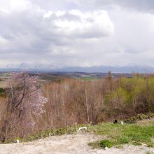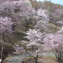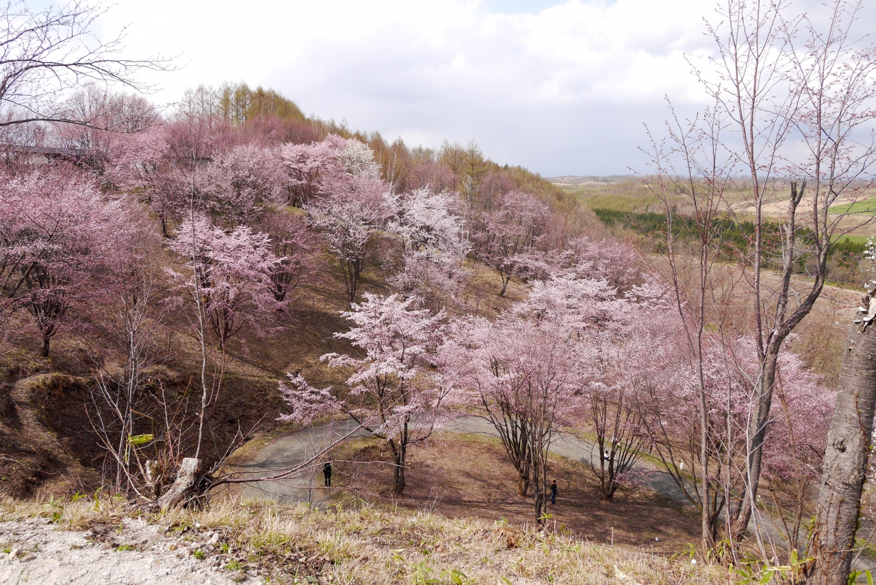 美瑛から富良野側に国道237号線,富良野街道を走り,深山峠を少し過ぎたところ,深山園ゴルフ練習場の手前に,駐車場がある.その下の桜並木がとてもきれいだった.5月初旬ここをとおるときには寄るといいと思う.