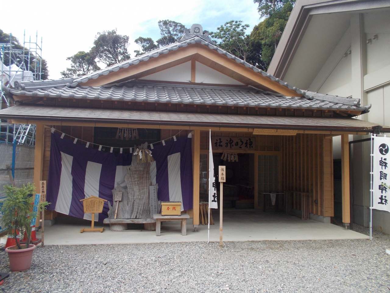 近くには何箇所かの無料の駐車場がありました。神明神社は、この時ちょうど仮本殿で、工事中でした。女性の願い事1つを聞いてくれるとのことでしたが、男性の願い事は叶うんでしょうか。