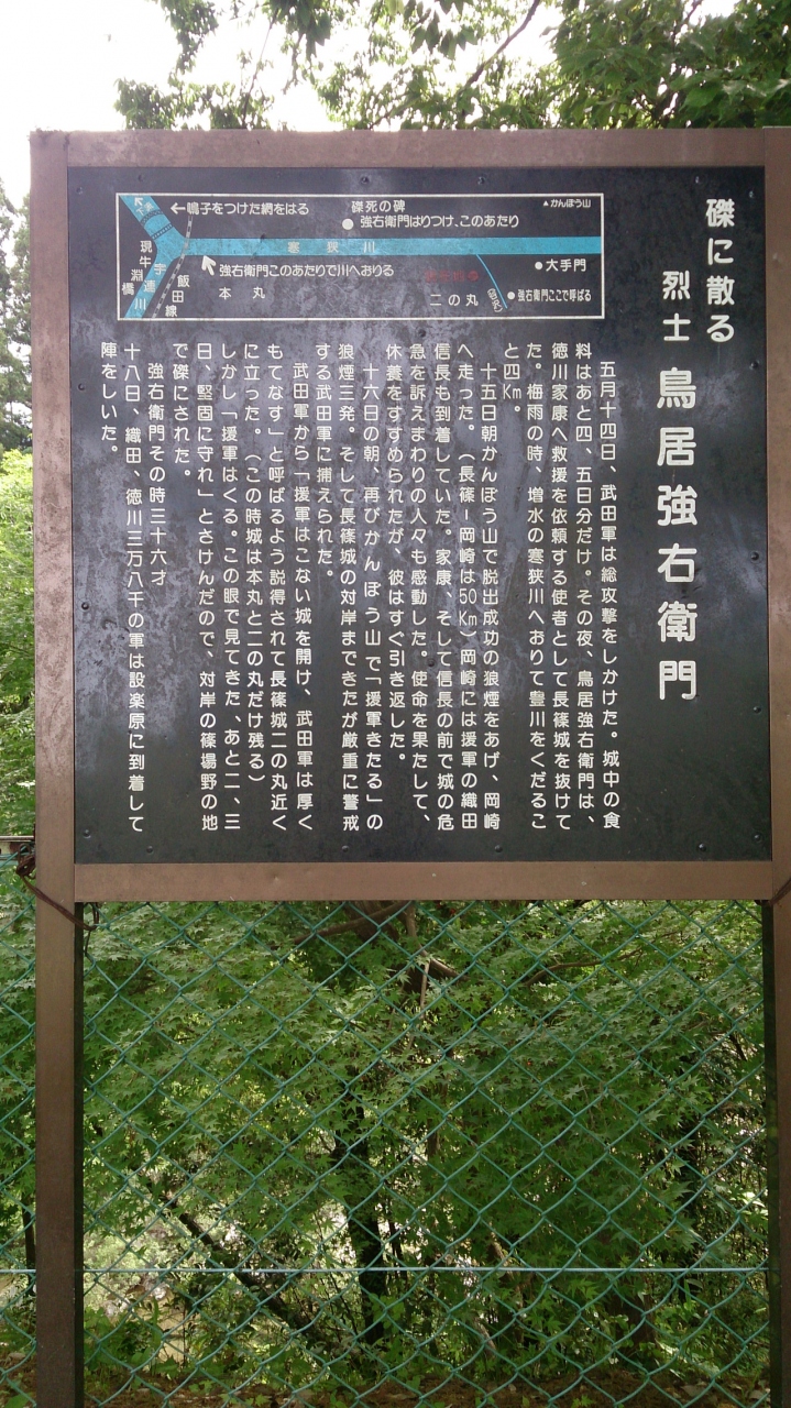武田勝頼軍15000を奥平貞昌ら500人の兵で城を守ったときに鳥居強右衛門が活躍したことで有名な長篠城。天然の要害の長篠城もさすが多勢に攻められ落城も時間の問題でした。しかし当時の谷底は今でもそのままで当時の攻めにくさを見ることができます。堀も復元されています。