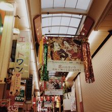 冠の商店街名にちなんで上に曽根崎心中のお初と徳兵衛の垂れ幕(?)が飾ってありました