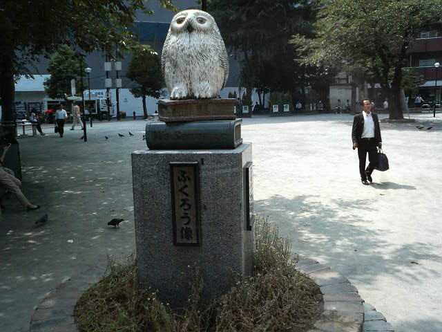 (公園入口には、池袋らしく白いフクロウ像があります)