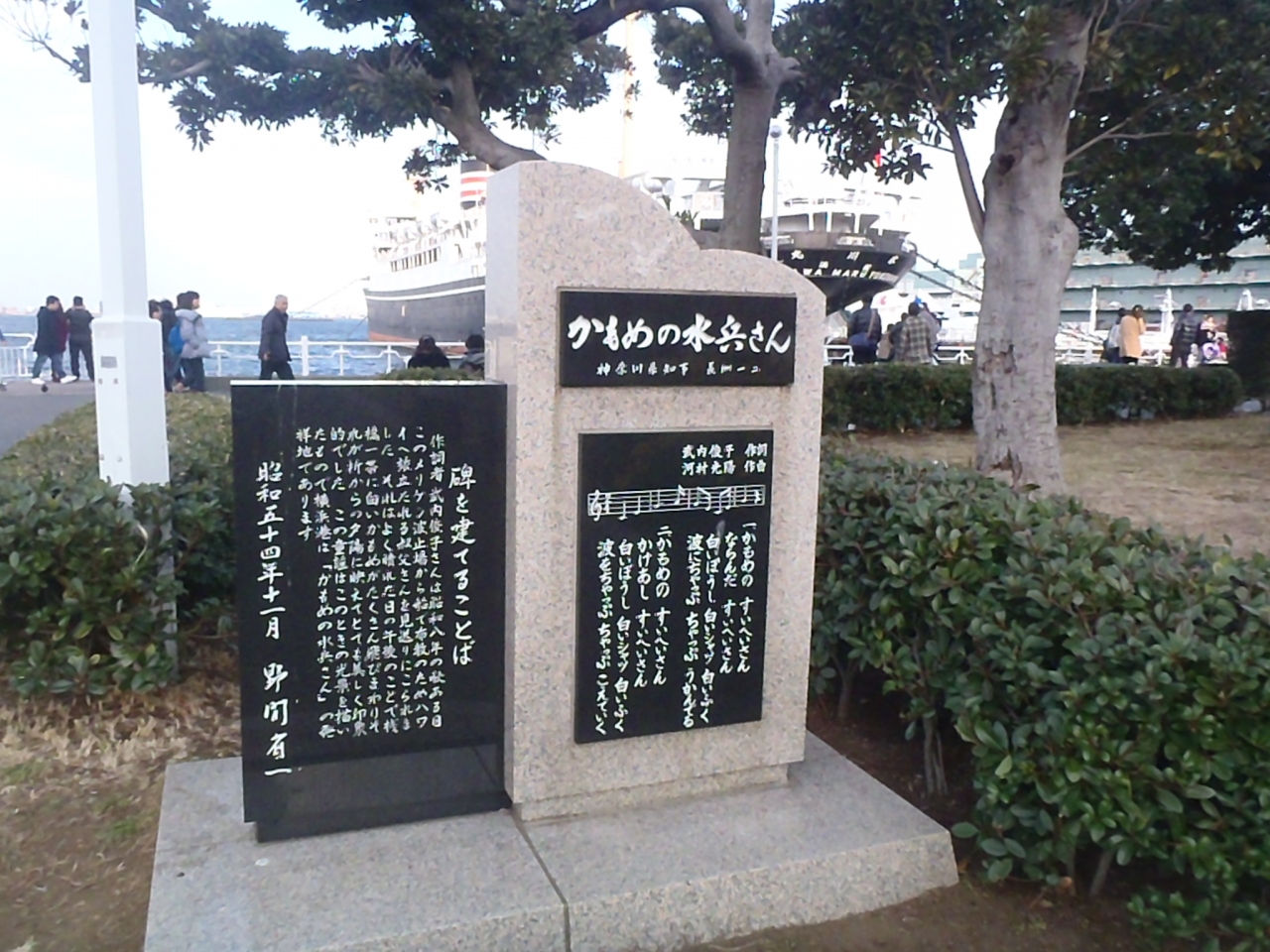 みなと横浜の観光には欠かせない山下公園にお馴染みの童謡かもめの水兵さん歌碑があります。