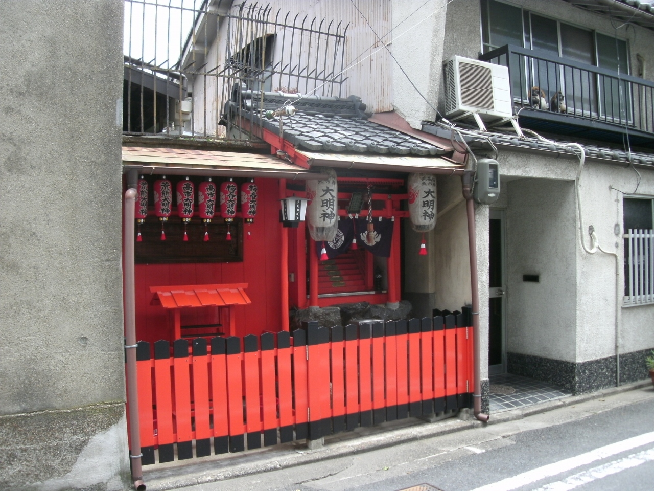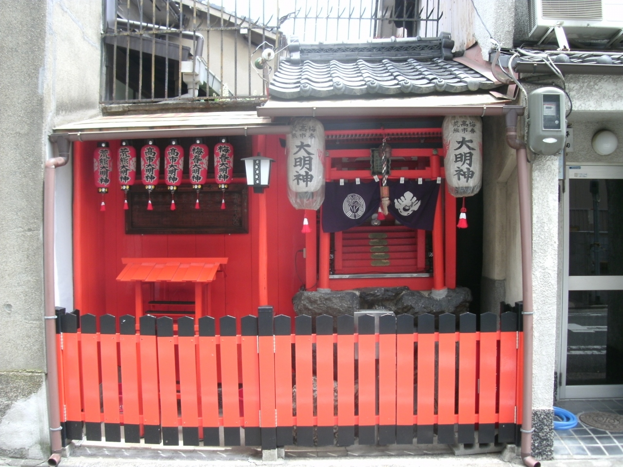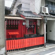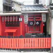 渉成園(枳殼邸)の北側に鎮座されています。付近を歩いていて偶然見つけたのですが、民家の間に挟まれた小さな神社で、由緒書きも無もありませんでしたが、真っ赤に塗られた小さな社殿や柵はきれいに手入れされていて、地域で大切に祀られていることが判りました。