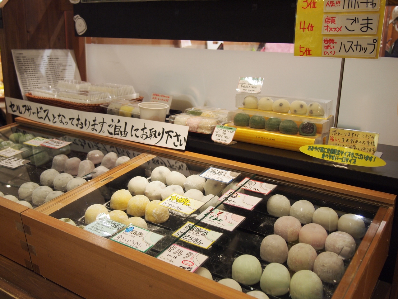 新千歳空港のターミナルビル2階に入っています。店頭にずらりと並んだ色とりどりの大福が目を引きます。