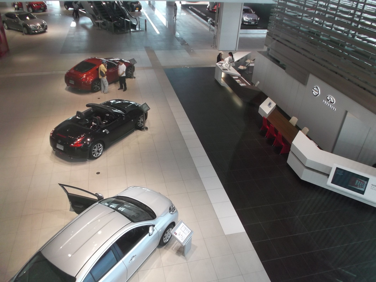 日産のショールームです。吹き抜けのビル空間に日産が誇る車が展示されています。いろいろなイペントもあるようです。ミス・フェアレディが迎えてくれます。試乗も可能です。