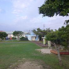 赤瓦の古民家が中央にある公園。