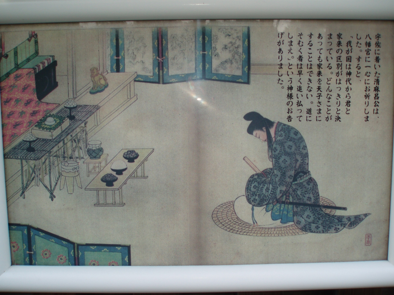 和気清麻呂の宇佐神宮神託の事件一連の事件の経過を彼の生涯を通じて分かりやすい解説とイラスト画で説明したパネルが神社の外周のぐるりと取り囲んでいて、ぐるっと見て回ると彼の生涯が一目楼然と言う神社の由来がわかりやすい神社です。