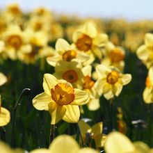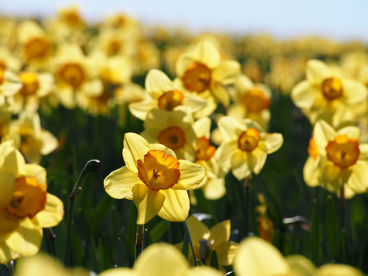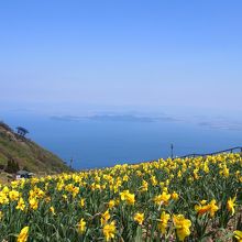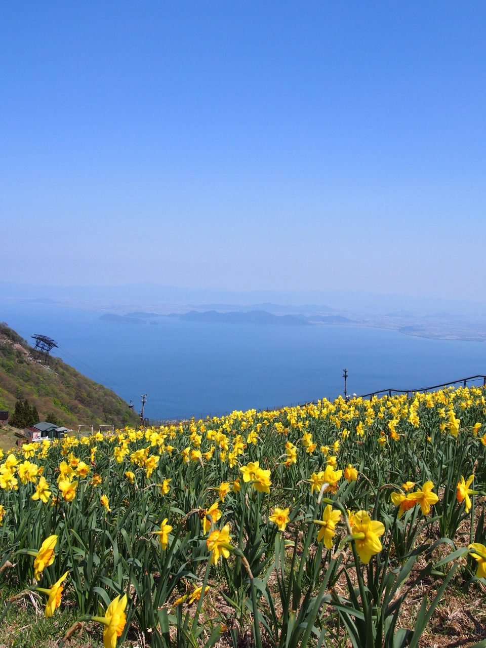 その名の通り、琵琶湖が一望できるスキー場。実はスイセンが麓よりも少々遅れて楽しめる隠れた名所でも。自身が訪ねた際は雲一つない快晴。スイセンの黄色と琵琶湖の青、空の青が見事なコントラスト。