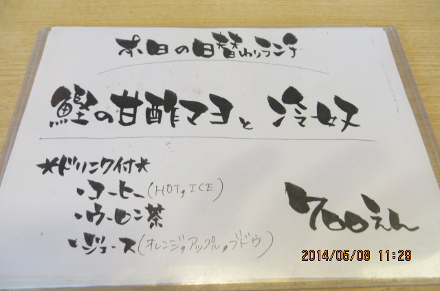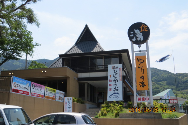 大きな看板が目立ったので、昼食に立ち寄りました。入り口から入るとまず、靴を脱ぎます。床は厚い板で出来ていて、いい感じです。本日の日替ランチ、鰹の甘酢マヨと冷奴に飲み物がついていました。結構なボリュームでおいしかったです。地元の人はここのお風呂にも来る様で、普段着の家族連れがお風呂の方へ歩いて行く姿が見えました。