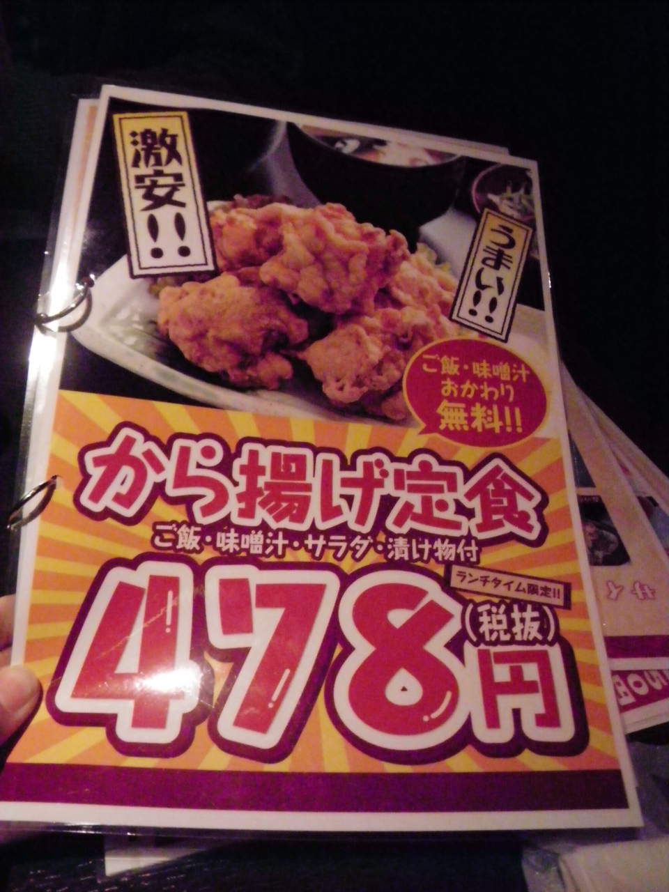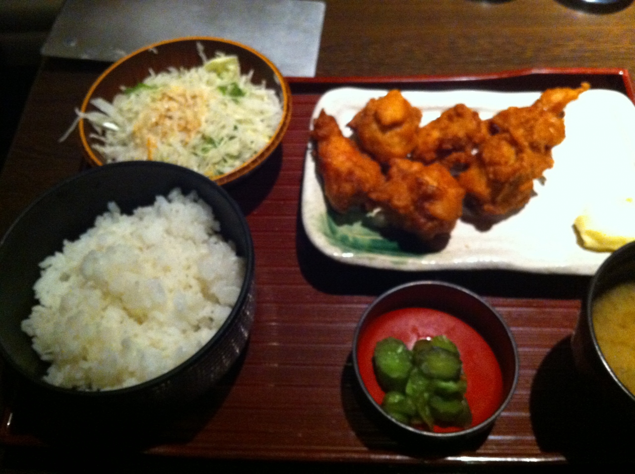 札幌駅直結の地下街アピアにある居酒屋です。ランチタイム限定の唐揚げ定食をオーダー。唐揚げ5個にサラダ、味噌汁、香の物、白飯のしっかりした内容で478円(税抜)。お味もまずまずだし、味噌汁&白飯はおかわり自由!コスパ◎のランチでした。