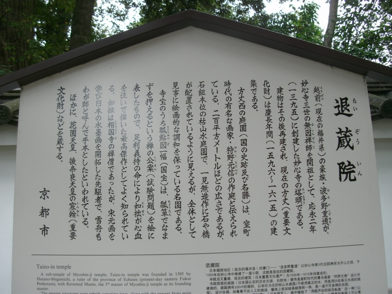 常時公開されている塔頭の一つで、素晴らしい庭園と、国宝に認定されている“瓢鮎図”が一番の見所です。山門をくぐり参道を進むと左手奥に国の重要文化財の方丈があり、方丈の西側には枯山水の庭園があります。さらに奥に進むと中根金作氏作庭で昭和の名庭と言われている池泉式庭園の“余香苑”があります。人気の塔頭で、何時行っても観光客が多いところです。
