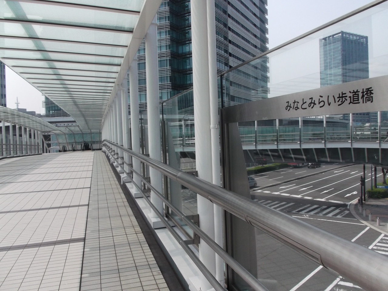 この人道橋「はまみらいウォーク」と名付けられています。距離100米足らず・幅は10米ちょいですかね。延長線上にはみなとみらい歩道橋が続きそこからのみなとみらい21の景観は気持ち良いものです。
