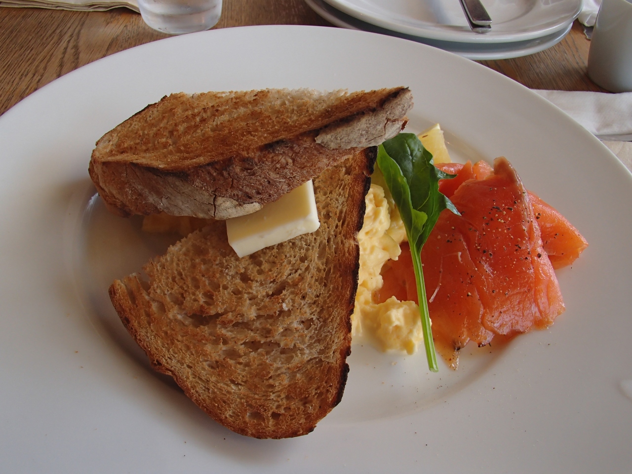 朝食プレートにサーモンをプラス、リコッタチーズのパンケーキ(3枚あります)の2品を注文しシェアしました。