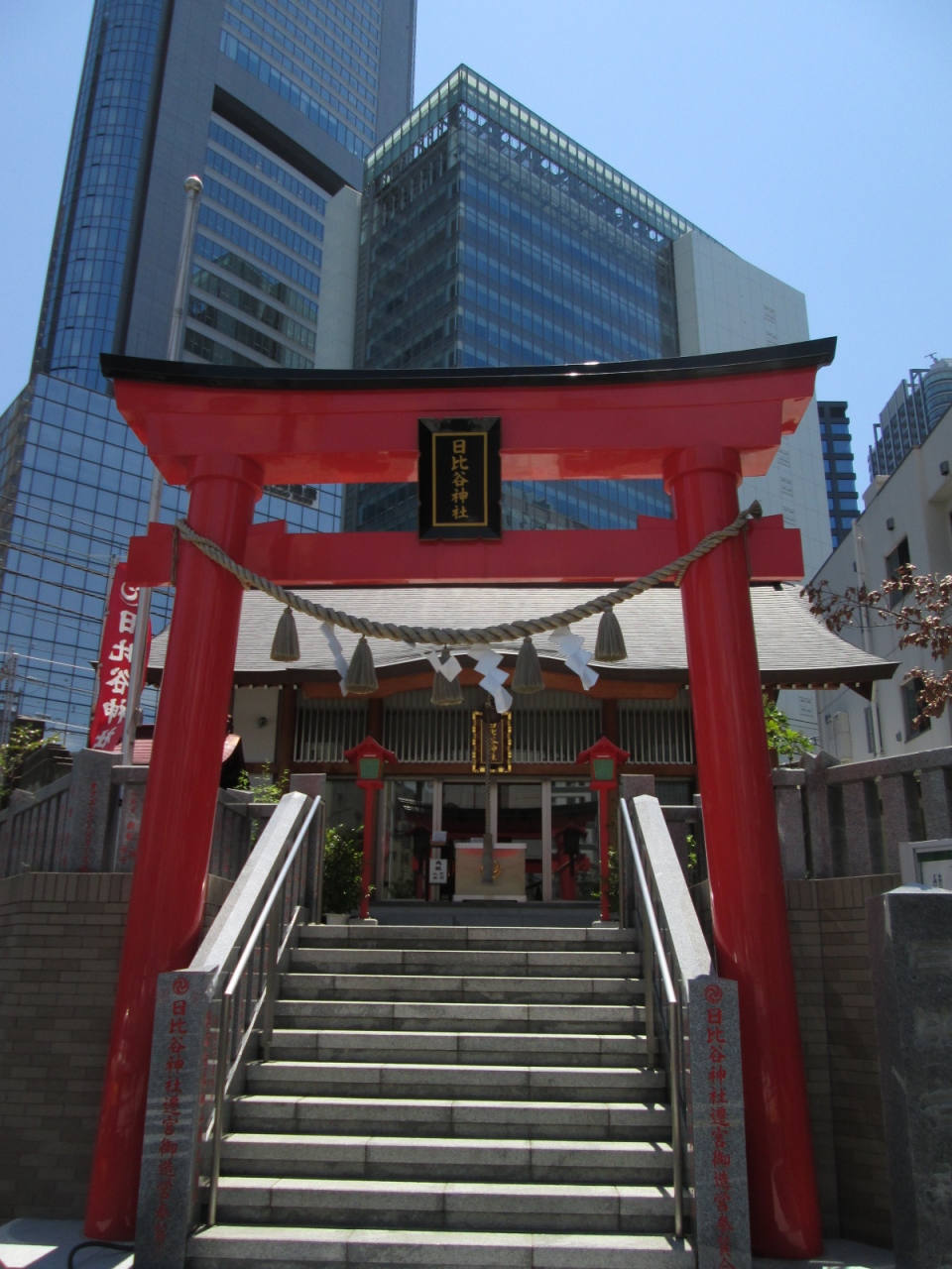 高層ビルを背景に建っている朱色の鳥居と本殿。周りは、JR高架橋と大きな道路。都会の中に、ぽっかり空いた、癒しどころって感じの神社です。趣は近代的な造り・・・後で調べてみたら、H21年にこの地に遷座したとか。時代の波に負けず立っている鳥居を見ると、何だか勇気付けられますね。