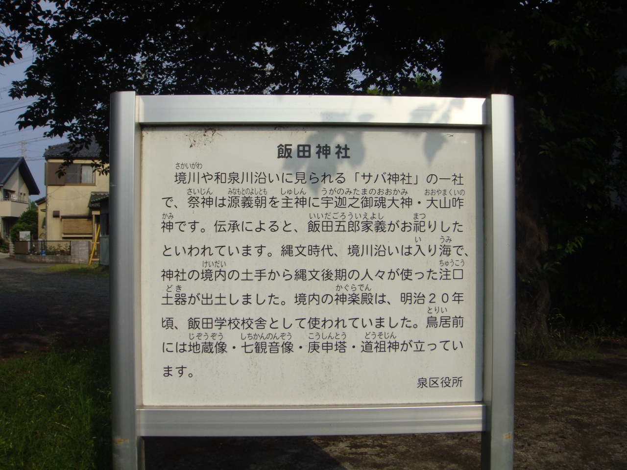 飯田神社は、相模川沿いに祀られているサバ神社の1社で、明治6年(1873)に上飯田村の村社に指定されています。境内には、横浜市の名木古木に指定されているヤブツバキや庚申塔、道祖神、地蔵などがあます。どこにでもあるような神社ですが、ここが横浜か?と思われる場所にあります。