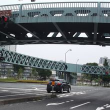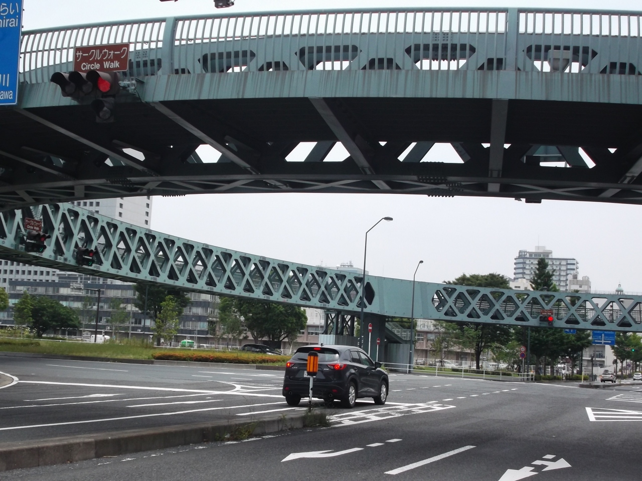 新港中央交差点の上に架かる円形の歩道橋。横浜ワールドボーターズ2階、JICA横浜国際センター2階海外移住資料館入口につながっています。国際大通り方面から赤レンガ倉庫に向かう際にはここを通ります。エレベータ設備がJICAの建物と向こう側にあるので利用できます。