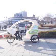 流線型の三角錐ボディー前に運転手、後ろに2人乗り客用のシート、最低料金300~で観光スポットを巡ってくれます。