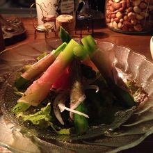 ハートランドとアスパラの生ハム巻き、ヒューガルデンとゴルゴンゾーラのペンネをいただきました。