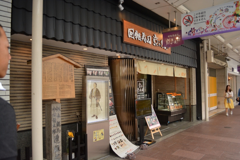 前は何も標識などない地味な場所ですが、いまはかなり立派な標識があるので、写真を撮る人もちらほら。ちなみに近江屋跡地は現在、サークルKになっています。少なからず因縁のある三菱商事がやっているローソンだたったらよかったのかもしれない。