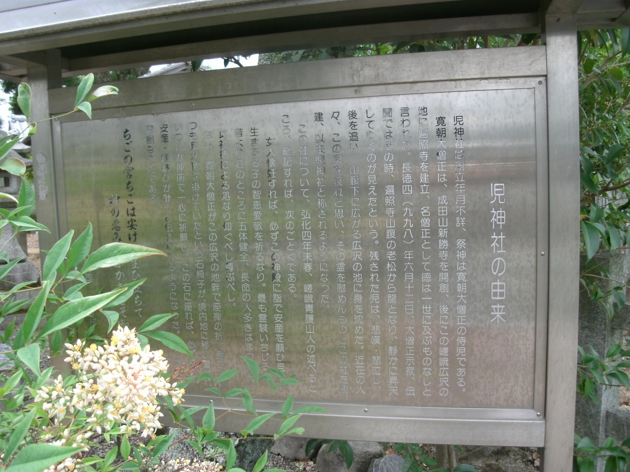 嵯峨広沢に遍照寺を建立した平安時代の真言宗の僧・寛朝の侍児が祀られています。寛朝の死後、残された子供は、嘆き悲しみ広沢池へ身を投げて僧正の後を追ったことから、不憫に思った近くに住む人々によって子供の霊を慰めるために神社を創建したという悲しい言い伝えがあるそうです。