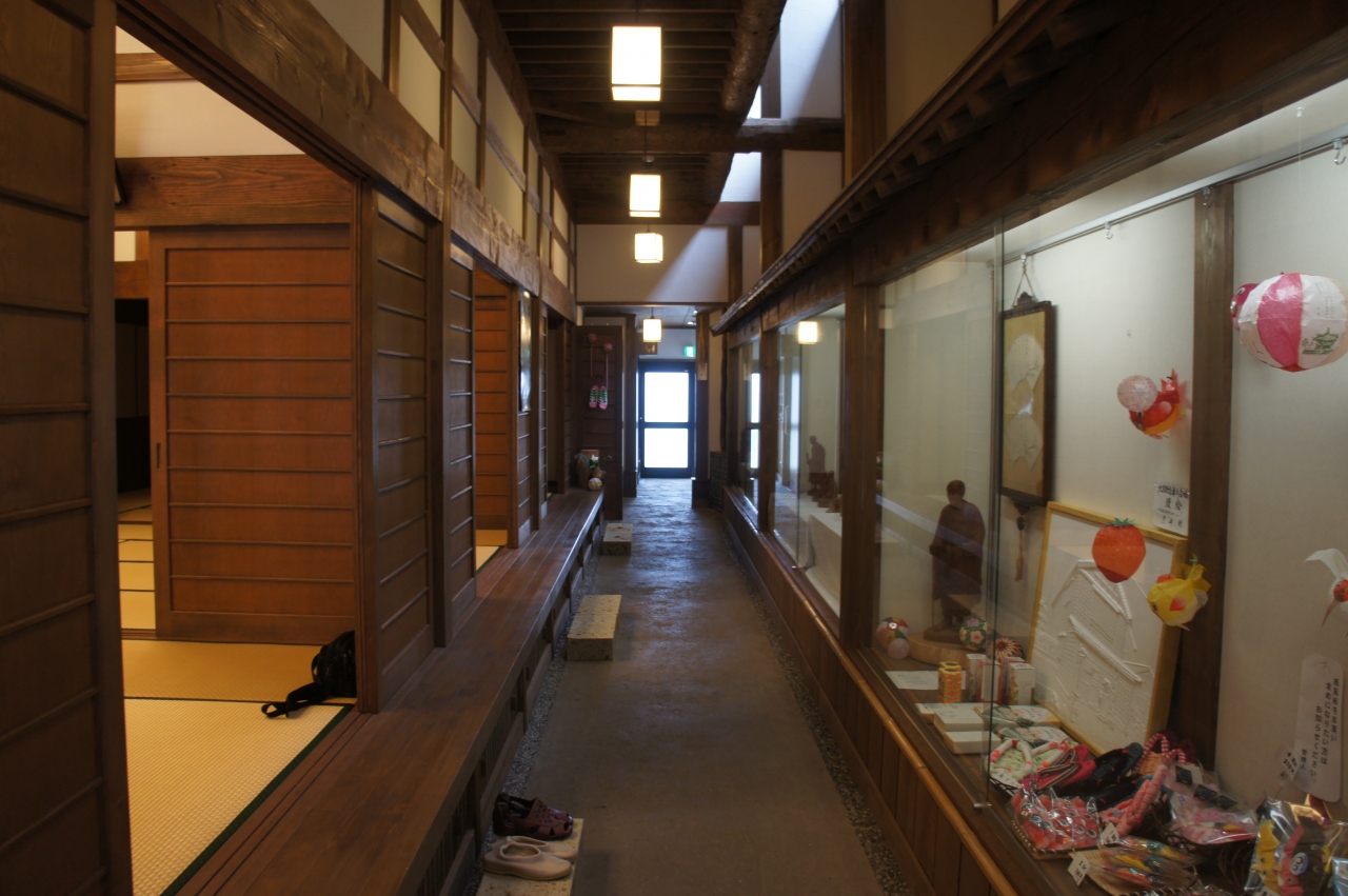 北国街道 妻入り会館は、出雲崎の妻入りの街並みの中ほど。かつての町家を保存したもの。外から見ると何でもないような建物なのに、奥に長い内部は思いのほかゆったりしていて、がっしりした構造です。良寛関係の木像や書なども展示されていて、ボランティアの方が簡単な説明をしてくれました。座敷に上がれば、休憩場所としてもいいかと思います。